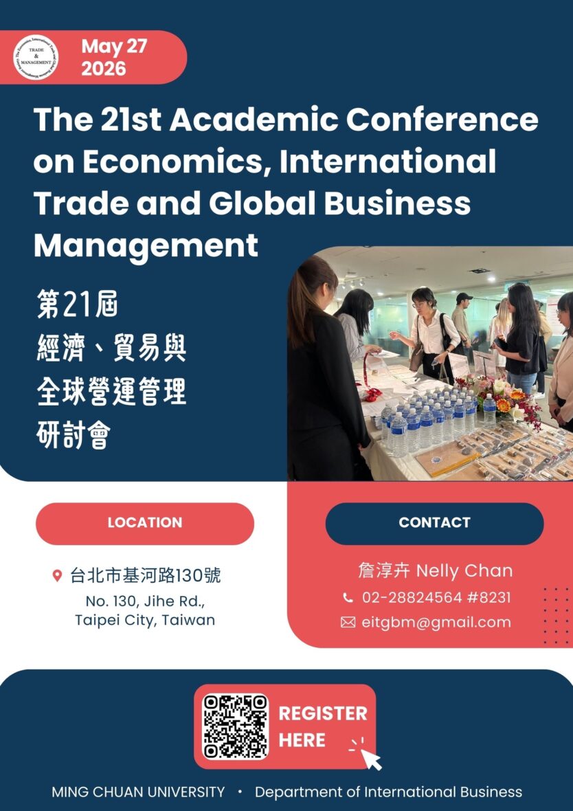 2026「經濟、貿易與全球營運管理研討會」將於2026年5月27日(星期三)舉辦。本次研討會將採用線上線下混合模式舉行,能親臨現場的作者將參加在銘傳大學基河校區舉行的線下會議及活動,無法親臨現場者也有Google meet線上報告模式可供選擇。請透過Google表單報名同時上傳論文摘要,並選擇自己所偏好的報告模式,包含選擇線上報告或現場報告以及中文場次或英文場次。此外,請務必詳細填寫所有作者姓名及正確作者序列、文章名稱及通訊作者資訊,以利提供發表證明文件。